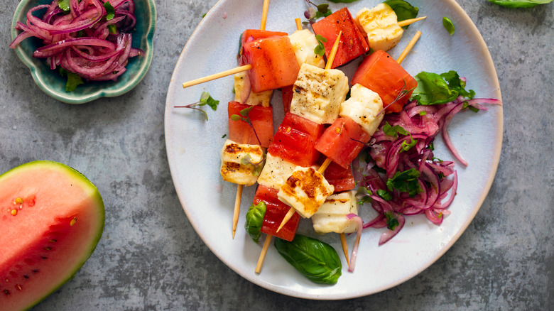 You should leave the rind on watermelon when grilling, especially when it comes to kabobs. If you can include a small section of the rind with each chunk, this can ensure that it won't fall off the kabob, as you can skewer it right through the green and white portion. In addition, grilled rind can be consumed, which you can leave up to the discretion of your guests. However, if you'd prefer not to include the rind, simply be sure to layer your watermelon tightly between sturdy ingredients to help ensure that it won't shift and break apart. This juicy addition will for sure get your fingers sticky, so if folks are enjoying their kabobs right off the skewer, include a large boat-shaped onion or pepper on the bottom of the skewer to help protect your guest's hands from inevitable drips.