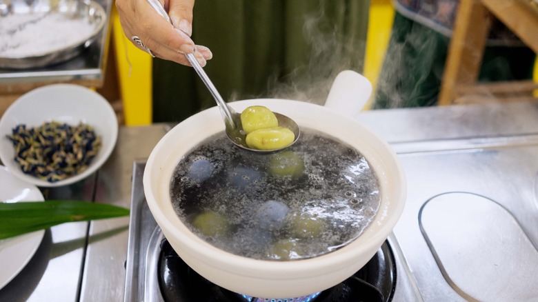 A simple recipe enjoyed across a large region, Onde-Onde comes in many forms. Some add tapioca flour to the mix, while others up the coconut flavor with milk. While pandan is a cornerstone flavor of the dessert, it's sometimes complemented with sweet potato. Another version forgoes the tropical plant completely, instead infusing the dough with butterfly pea extract.