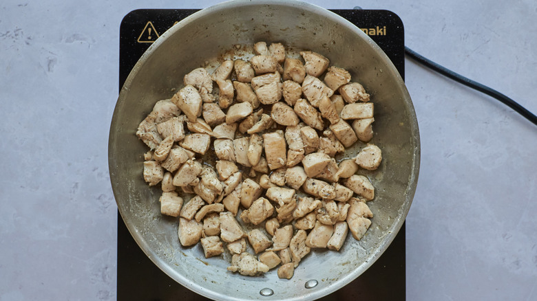 - Heat an oiled skillet over medium heat and add chicken. Brown the chicken on all sides until completely cooked through, about 8-10 minutes. Let cool completely.