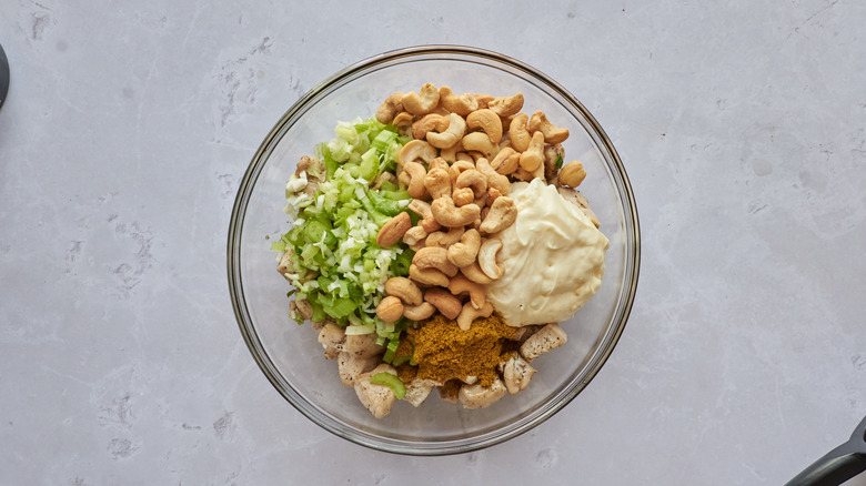 - Add chicken, celery, scallions, cashews, mayonnaise, lemon juice, and curry powder to a large bowl. Mix until completely combined.