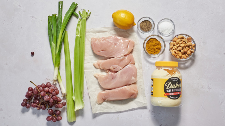 The ingredients needed for creamy curried chicken salad