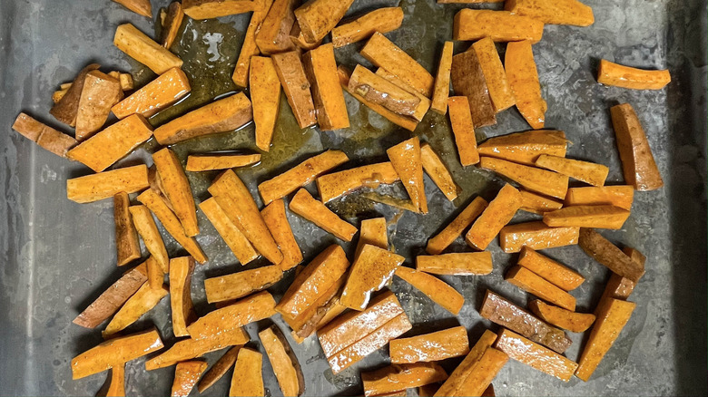 There's a lot to love about sweet potato fries. They are rich in vitamin A, pack in more fiber than a regular potato, and provide a healthy dose of antioxidants. Oven-baking them may be easier than deep-frying because you don't have a giant pot of scalding oil to deal with, but deep-frying has some clear advantages, primarily that it gets food immensely and evenly crispy. Luckily, Tasting Table recipe developer Kara Barrett has a fool-proof method for crispy, oven-baked sweet potato fries that all boils down to when you put the sheet pan in the oven.