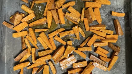 Most people would probably follow the standard steps: turn on the oven to the desired heat; while it warms, cut the sweet potatoes; toss them in oil and other seasonings; scatter them evenly over a sheet pan; and slide it in the oven to bake. Barrett's method switches up one simple part of the equation: She puts the sheet pan in the oven while it warms to 500 degrees Fahrenheit. Once the oven is at temperature, she (carefully) removes the screaming hot pan, dumps on the cut sweet potato fries, and spreads them out with a wooden spoon or spatula. Says Barrett, "They sizzle when they hit the pan. It's a pretty gratifying sound." Note too, that she turns the oven heat down to 450 degrees at this point, ensuring the sweet potato fries don't burn before they've had a chance to cook through.