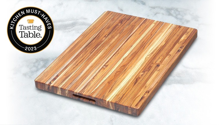 We fell in love with this massive 24-by-18-inch TeakHaus board for this reason. No matter how complicated the recipe, this board could comfortably hold all the ingredients with room to spare for chopping. Although there are some sustainability concerns about wild-harvested teak, the manufacturer says the wood in this board is sustainably sourced from plantations. This type of wood is ideal for cutting boards because it's durable and ages attractively. The teak wood also felt lighter for its size than the maple, which was an asset for such a big board. The inset handles carved into the sides made picking the cutting board up off the counter easier when we did have to wash it in the sink.