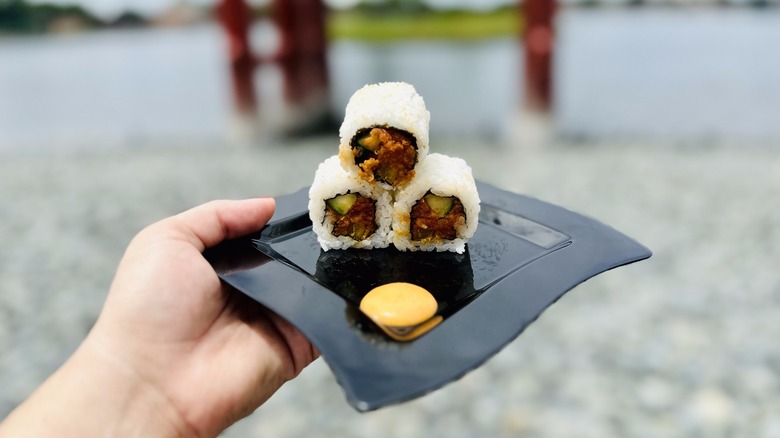 Beneath the spiciness lies a combination of cucumber and pickled daikon radish. Their cool, crisp textures are a welcome contrast to the spicy tuna, providing a reprieve that allows the spiciness to shine without becoming too much. Accompanying the roll is a zippy spicy sauce. When paired with the sushi, it adds an extra dimension to the overall flavor, enhancing each ingredient while tying them together in a fiery embrace.