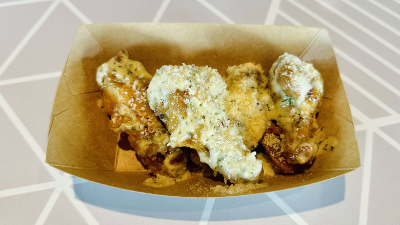 You'll notice the abundance of sauce as soon as you bite into one of these wings. They're generously coated in a thick, indulgent layer of garlic parmesan goodness that is sure to please. This isn't a light glaze; it's a hearty sauce that fully envelopes the wings, ensuring that each bite is packed with flavor. In fact, we think there's more sauce on these wings than there were last year.