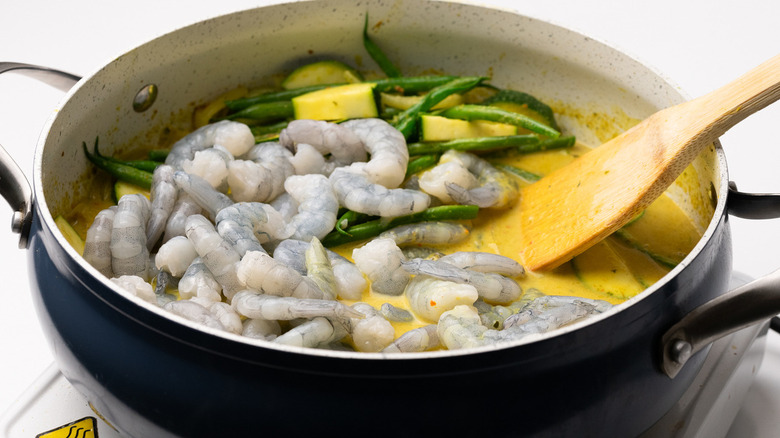 - Add the zucchini and the green beans to the pan, followed by the shrimp. Cook for 3 to 4 minutes until the shrimp is just cooked and the vegetables are slightly softened but still retain some crunch.