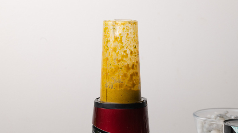 You'll need either a food processor or blender to make the curry paste, and if you opt for the latter, it's best to use a small one. Add the peeled ginger, red chile, garlic cloves, lemongrass, galangal paste, cumin, turmeric, cilantro, and 1 to 2 tablespoons of water to your processor or blender. You may want to start with 1 tablespoon of water and add more depending on the consistency of the paste. Blend everything together until a smooth paste forms — it should be somewhat thick, but not so thick that the ingredients aren't fully blended together.