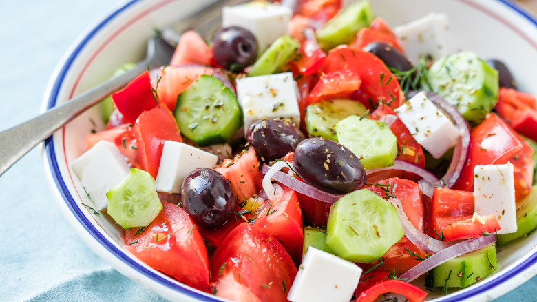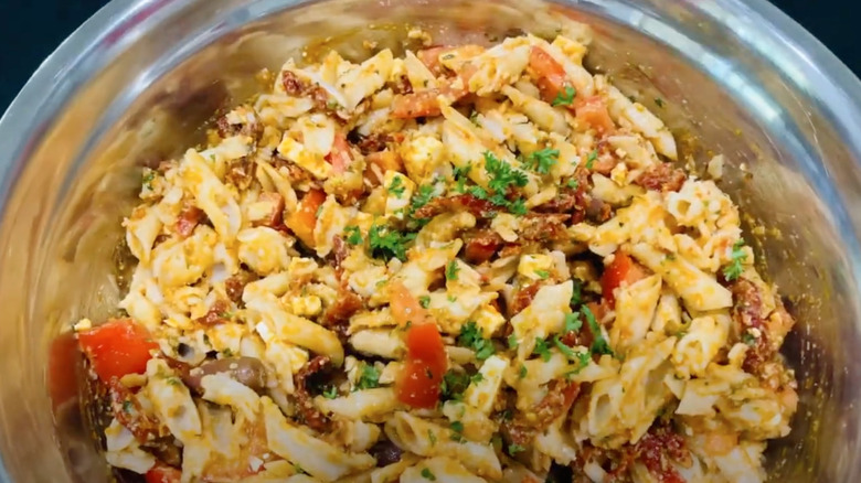 Pasta salad is perhaps the best kind of salad — you get all the freshness of a veggie-heavy salad, but you also get the delight of a bowl of pasta. That's why we love Ina Garten's tomato feta pasta salad, which offers both the juiciness of fresh tomatoes along with plenty of carbs to keep us satisfied. The ingredients that really shine in this dish include sun-dried tomatoes, olives, and feta, of course. All of these ingredients are especially salty, which provides the perfect backdrop for the otherwise bland pasta.