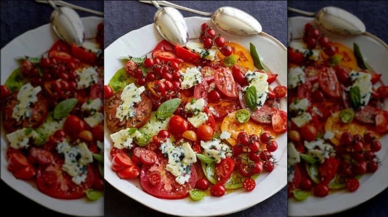 When it's way too hot out to cook, you have to turn to this supremely delicious recipe: It's Ina Garten's heirloom tomato and blue cheese salad, and it may just be our favorite tomato-based salad of all time. You really only need a few ingredients to put this salad together. First and most important is the heirloom tomatoes themselves. By getting a mix of cherry and larger tomatoes, you'll have a more varied (and more beautiful) final product. The second ingredient you need to snag is a blue cheese, like Roquefort. The bold sharpness of the cheese is just what the slightly sweet tomatoes need to bring out their savory side.