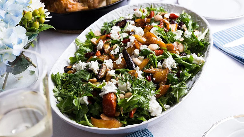 If you're looking for the perfect fall salad, look no further than Ina Garten's maple-roasted carrot salad from Ina Garten. Two whole pounds of carrots take center stage in this recipe. The other ingredients, like arugula, goat cheese, cranberries, and maple syrup just aim to highlight the roasted carrots' sweetness. Because there are so many carrots in the mix, this is a filling recipe, but its lack of meat means it's also not too heavy.