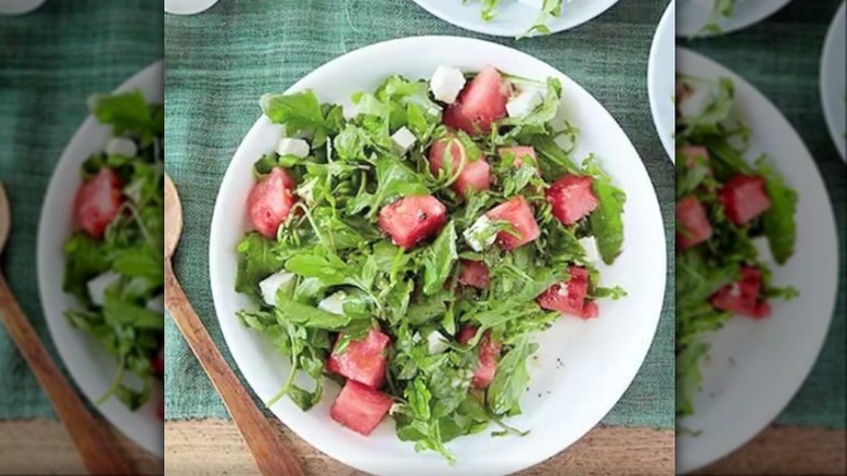 Watermelon and arugula may not sound like the most natural pairing in the world, but believe us when we say that it really works in Ina Garten's watermelon and arugula salad. Like many of the Barefoot Contessa's recipes, it's simple but sophisticated with its mix of arugula and watermelon, of course, but also Parmesan and black ground pepper. Beyond that, all you'll need to finish off this easy salad is some olive oil, lemon juice, and salt. Sometimes, the best things really are that simple.