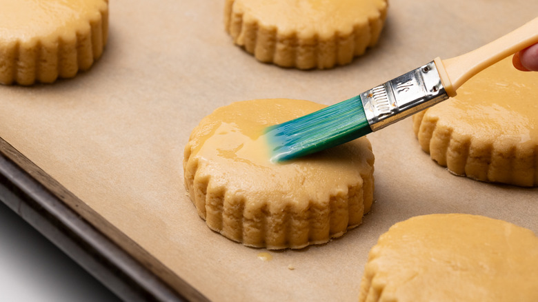 - Brush the tops of the scones with a little whisked egg, and then place them into the oven to bake for 15 minutes, until risen and golden brown on top.