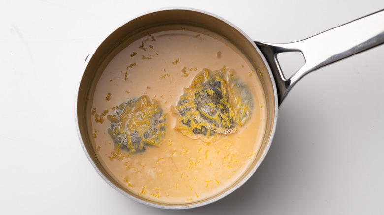 - Add the milk to a small saucepan. Heat up the milk over a medium heat until it reaches simmering point, then remove the saucepan from the heat and add the Earl Grey tea and the lemon zest. Allow the mixture to steep, and strain once the milk has reached room temperature to remove the tea bags and the lemon zest.