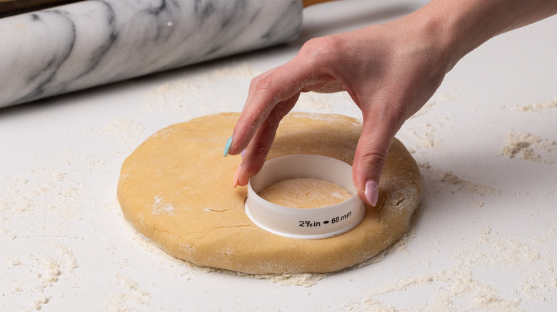 - Mix the ingredients together to form a soft dough. Lightly flour a clean surface and then roll out the dough to roughly 1 inch thick. Using a 2 ⅝ inch crimped cookie cutter, cut out scones and place them onto the prepared, lined baking tray. Alternatively, the dough can be cut into wedges.