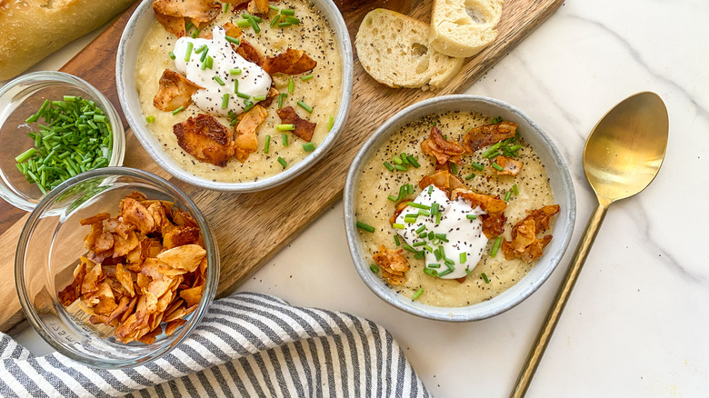 When the potatoes are tender, blend the soup in a blender and return to the pot. Add the blended cashews. Top with the coconut bacon and add optional chives and vegan sour cream.