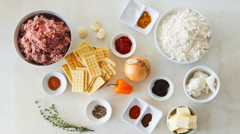 The outer crust of the patties is made from flour mixed with a combination of butter and shortening while being seasoned with turmeric and salt. The filling is comprised of ground beef flavored with onion, garlic, Scotch bonnet pepper, thyme, allspice, smoked paprika, beef bouillon, seasoned salt, black pepper, and ketchup, and then bulked up with crackers. While Maroney feels that "Ritz or another buttery cracker work best for the filling," she does say that "any cracker will do." She also says that ⅓ cup of breadcrumbs can be substituted for the crackers.