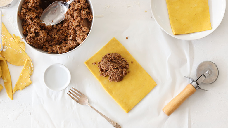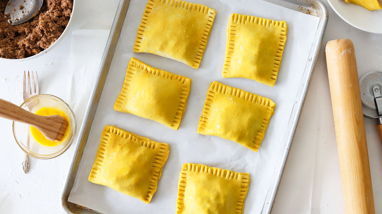 - Spoon ¼ cup of the beef mixture into the center of one of the pieces of dough and fold the dough over the filling, then press down the edges into a slightly rounded square and crimp them with a fork. If the edges aren't sticking well, add a little water to the edges before crimping.