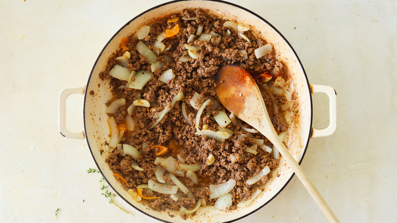 - Add the chopped onions, garlic, and Scotch bonnet pepper to the ground beef mixture and cook until the onions are slightly softened.