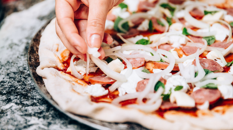 Then, Richer advised the importance of paying attention to texture and the size of toppings. He told Tasting Table, "Be sure to cut vegetables, cheeses and meats to their ideal size so they bake properly on top of the pizza. Use the supporting ingredients thoughtfully to provide texture, acidity, and overall balance to the pizza." After all, the last thing you want is for your toppings to be so big that it makes it difficult to lift and eat the pizza slice — or for one topping to overpower another.
