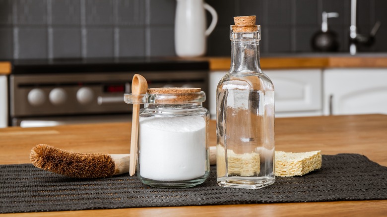 To kick things off, make a super grease-fighting paste out of baking soda and a few spoonfuls of water. You'll smear this paste all over the interior glass window with your sponge or cloth, making sure to concentrate it on the particularly stubborn grease patches. Let this paste sit for 10 minutes, allowing the basic baking soda to dissolve the dirt and grease clinging to the glass. Next, you'll make a solution of one part distilled white vinegar to four parts water. You'll then dip another microfiber cloth into this solution and use it to wipe away your baking soda paste.