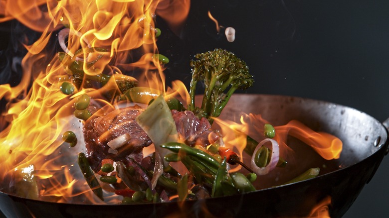 The grill is often considered the cooking staple when it comes to camping. Most campsites offer a charcoal grill, or if you prefer, you could cook over an open flame and a grill grate. But outdoor cooking doesn't have to be limited to grilling. Did you know that you're able to cook unique outdoor meals in a traditional wok? Guy Fieri himself even recommends the wok as an excellent tool for camp cooking. "The wok is one of my favorite things to work with when I'm camping," he told Food Network. "Outdoor cooking is not just about hot dogs and hamburgers. There are so many styles of food you can make."