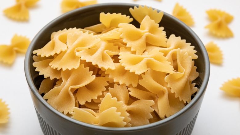 While it makes appearances in many restaurants, delicatessens, and fridges of food fanatics, farfalle pasta salad is not the way to go, especially for those who prefer olive oil-based dressings. Affectionately called bow tie pasta for its distinctive shape, farfalle might seem like a fancier pasta salad option than the basic fusilli, but it's just not the right pairing for the best result. Farfalle noodles have knots in the middle that are prone to stiffness, especially when prepared al dente.