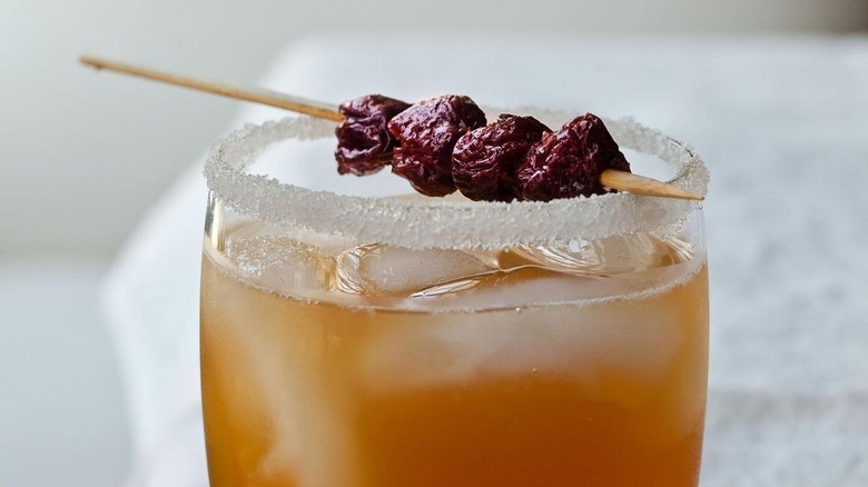 But don't go scouring the grocery store shelves for this ingredient. Chances are, you're not going to find it there. Luckily, you can make it yourself at home, though you will need to get hold of some dried cherries. Combine ½ cup of these dried cherries with 4 ounces of bourbon and zap this mixture in the microwave for 60 seconds. Then spear the cherries with a toothpick and use them to garnish your cocktail. For the whiskey sour itself, you can use your favorite recipe, or follow our classic method from Tasting Table, made with simple syrup, egg whites, whiskey, and lemon juice.