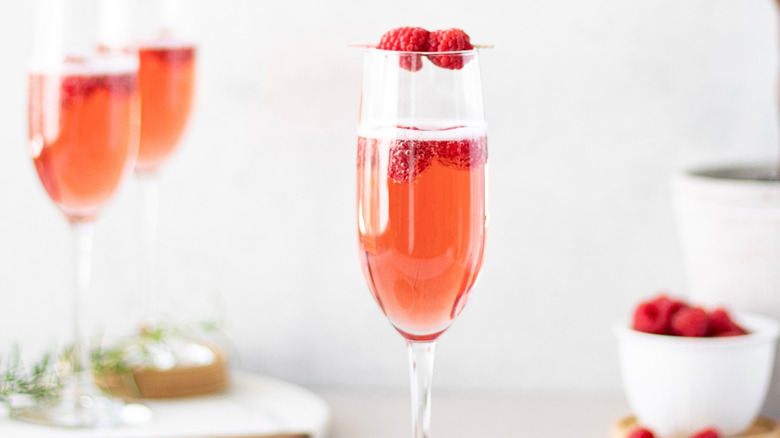 Ina Garten to the rescue. Although she has been known to make a fine Kir Royale in the traditional method, as she's done for her husband in romantic Valentine's Day gestures, she suggests using raspberry liqueur instead, which is much easier to spot on American liquor store shelves. And to add a touch of class, you can even add a few raspberries to your cocktail. Just pop a few right in your champagne flute, or you can skewer them on a toothpick and balance them on the rim of the glass. And since the ingredients are so simple here, be sure to use good quality ingredients: opt for your favorite type of bubbly, and confirm that your raspberries are nice and fresh.