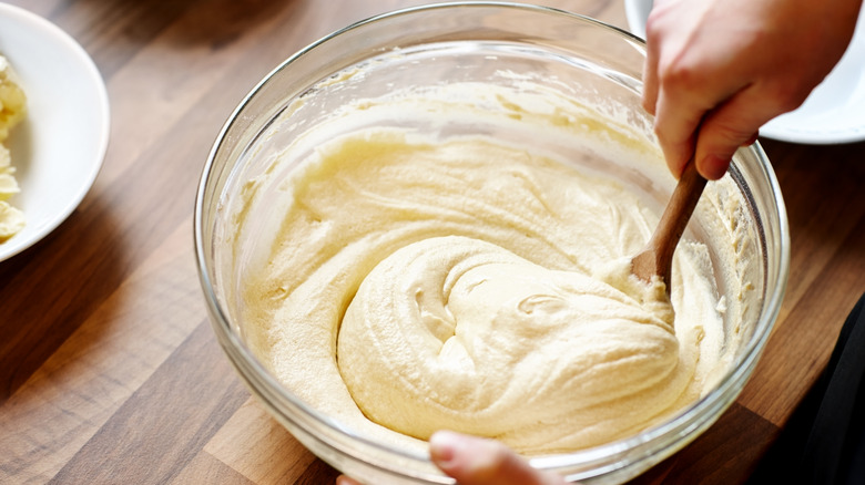 Before you reach for your mixer, check the temperature of your fats. For the reverse creaming method, the temperature of your butter is very important to yield the best results. Softened or room temperature butter, cream cheese, and vegetable shortening are needed to properly incorporate the butter into the dry ingredients — if they're too cold, it'll be difficult to break them up and make a smooth mix. This is especially true for Philly fluff cake, which has three different fats that all have different consistencies when cold. At the right temp, everything should easily whip into a creamy spread before you need to add the other ingredients.