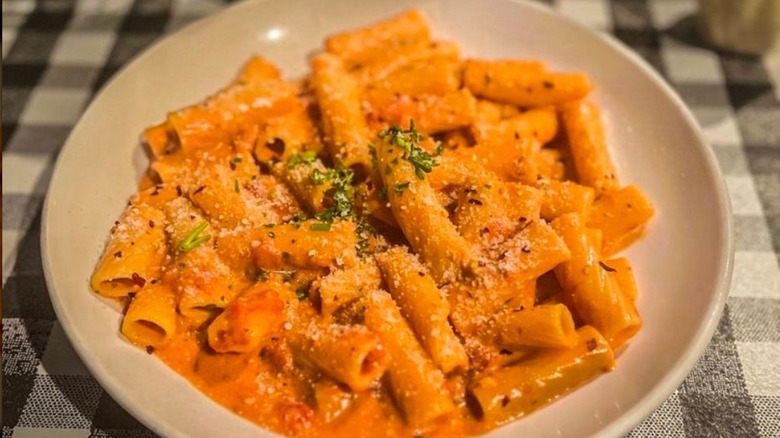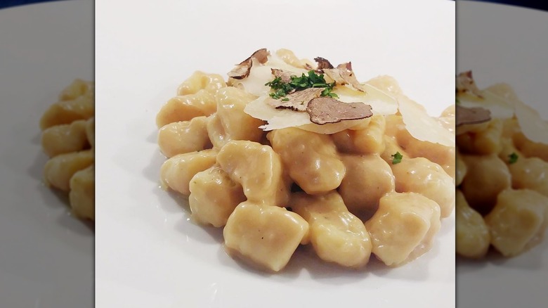 The ingredients may sound fancy, but luckily the preparation doesn't require any special skills. You'll start by making a broth out of the chopped lobster shells, stock, and mirepoix. Once the ingredients have cooked down a bit, add some sherry and tomato paste, letting them reduce as well. Place the mixture into a food processor until you obtain a mash. Cook that with some heavy cream and shave some black truffles on top just before serving. Serve this over-the-top sauce with stuffed pasta such as ravioli, tortellini, or gnocchi.