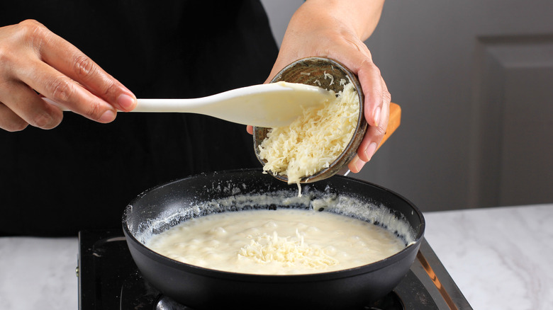 Like mornay, cheddar cheese sauce is a béchamel variation made by adding cheese to the original sauce. As you can probably guess from the name, this version substitutes the Gruyère and Parmesan for good old-fashioned cheddar. Although the two cheesy sauces have a lot in common, the milder flavors in the cheddar cheese variety might be more appealing to picky eaters. Similarly, it's a good option when making dishes like macaroni and cheese, lasagna, or cheesy rice as it won't compete with the other flavors.