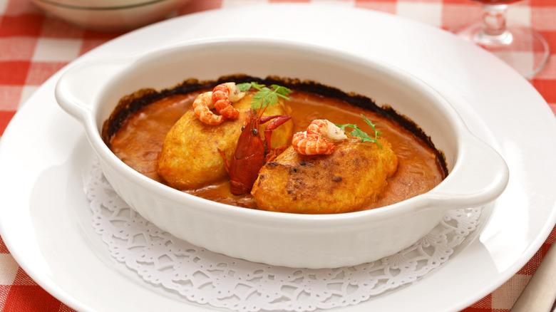 Named after Nantua, a small town in eastern France located between Lyon and Geneva, Nantua is a classic seafood sauce and one of the more unique béchamel sauce variations. It's made by combining béchamel with cream, crayfish butter, and crayfish tails. Crayfish butter and tails may sound like strange additions, but their presence makes a lot of sense when you consider Nantua's location. The commune sits on a 348-acre glacier-fed lake that's absolutely teeming with the aforementioned freshwater crustaceans.