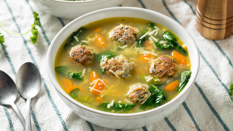 Another great thing about Italian wedding soup is that you can swap out ingredients depending on what you have, and it will still make great leftovers as long as you stick to the general formula. The meatballs can be chicken like Garten's, but beef or pork are just as good. Any slightly bitter green — like escarole or chard — can work in place of the spinach, and while orzo is the traditional pasta, you could easily use stars, ditalini, or even Israeli couscous instead. As long as you combine a flavorful broth with that mix of ingredients, you'll honor the spirit of this Italian peasant dish and be ready to feed yourself for days.