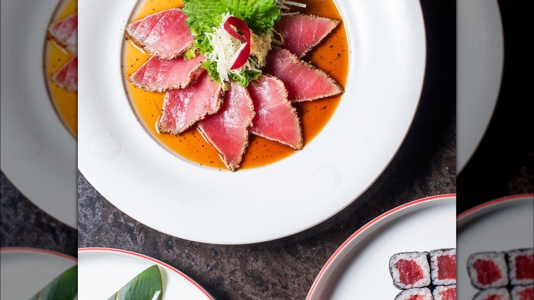 The Gensai roll is a spicy creation that uses fresh salmon, while the White Lotus roll is a decadent choice topped with crispy onions and wasabi truffle soy. The tuna carpaccio and truffle-topped toro are both must-order cold dishes, but if you're not a fan of tuna, opt for the serrano and yellowtail sashimi. The grilled meats and veggies are also worth ordering after you've wrapped up the sushi courses.