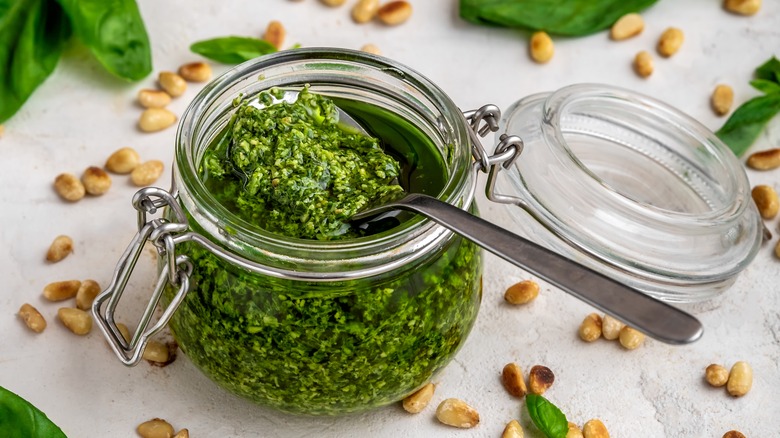 Just like basil makes an impact on the flavor of fresh tomatoes, there's an option to go even one step further when it comes to complexity. Basil is one of those sauces that often goes overlooked outside of the pasta sauce department, but can have varying applications in the culinary world. It's also quite adaptable, and you can produce endless variations if you know the basics of how to make basil pesto. Start with a foundation of basil, raw garlic, salt, pepper, and nuts. Classically, buttery pine nuts are used, but walnuts have a meaty flavor, and cashews can be mellow and chunkier. Use a combination of nuts if you desire, and wish to alter the texture and flavor. Use high-quality extra virgin olive oil, and include nutritional yeast, parmesan, or lemon juice to create an extra bitey punch of flavor. Overall, the sauce should be oily, intense, herby, and pungent.