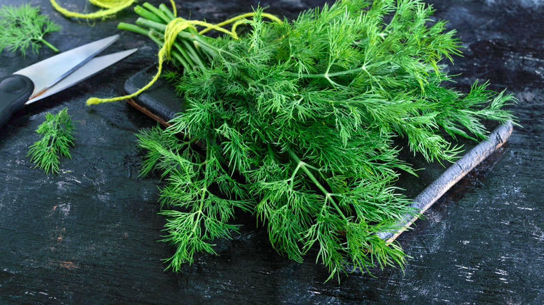 Although creamy sauces and cheeses tend to add contrast and boost the flavor of fresh tomatoes well, there is another direction that is just dying to be ventured. That's one of the refreshing, earthy, and delicate flavors, like those of fresh herbs. Dill, for instance, has a grassy flavor with undertones of citrus and anis. Its leaves are extremely tender and lacy, creating both a pleasing mouthfeel and a beautiful aesthetic. Because tomatoes are so delicate as well, the herb does a great job of blending into the flavor without altering the texture terribly. Try splashing your sliced tomato with a high-quality extra virgin olive oil, and using fresh dill to garnish.