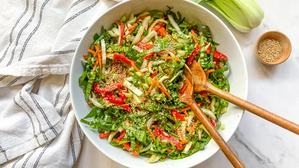 Wellness coach and recipe developer Miriam Hahn brings us this recipe for crunchy bok choy salad and says, "Bok choy has a mild, slightly sweet, and cabbage-like flavor and is a great leafy green choice for salads because it is heartier and will hold up if made ahead and packed in a lunch. I like to serve it with sandwiches, veggie burgers, or a big pot of soup." We love that it uses simple ingredients and can be thrown together in just 10 minutes.