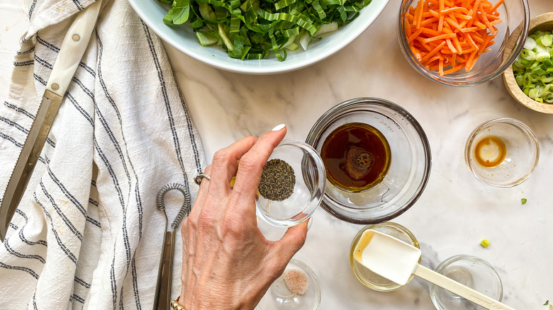 For the dressing, you'll need a small bowl and a whisk. Add the olive oil, sesame oil, soy sauce, rice vinegar, honey, salt, and pepper to the bowl and stir with the whisk to combine. "You can make the dressing ahead of time and just keep it in a sealed container in the fridge. If you have a couple of Asian salads planned for the week, double the recipe to save time," Hahn explains.