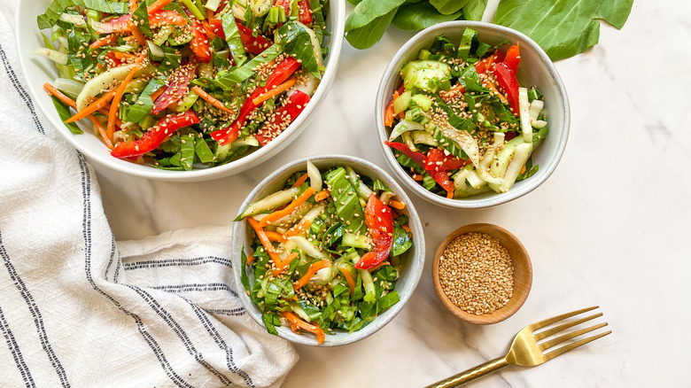 For the dressing, you'll need olive oil, sesame oil, soy sauce, rice vinegar, honey, salt, and pepper. "This simple combination of flavors makes a super flavorful dressing for this salad or any other Asian salad. You can easily swap out the honey for maple syrup if you want to make this salad vegan," Hahn remarks. Finally, pick up some toasted sesame seeds for the finishing touch.