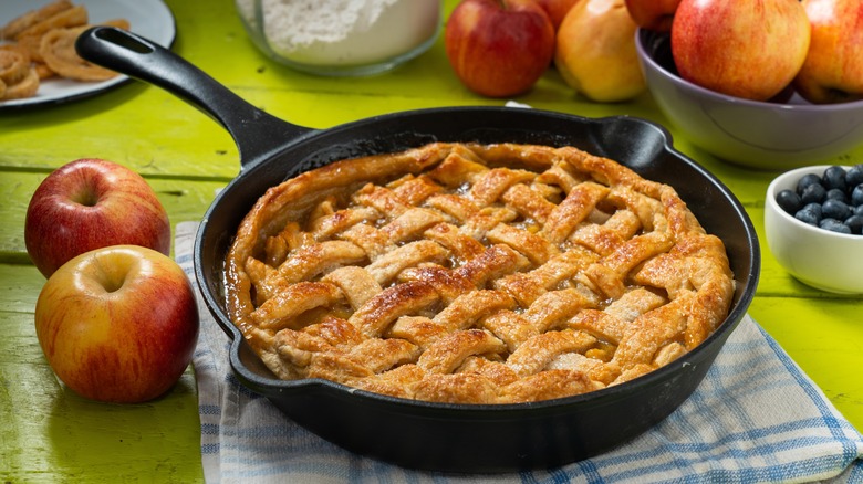 A cast iron skillet can help you make better pies because it retains heat much more effectively, which produces a perfectly browned crust. The heat capacity also helps melt the moisture in the dough quicker than a standard pie plate, contributing to a flakier crust. Another tool that works well for baking pies is the Swiss Army knife of pans: the Dutch oven. It's the cooking vessel you should use for a perfectly crispy pot pie crust because the high sides give the pie structure. Plus, if you're baking it with just the top layer, you can make the recipe a one-pot dinner.