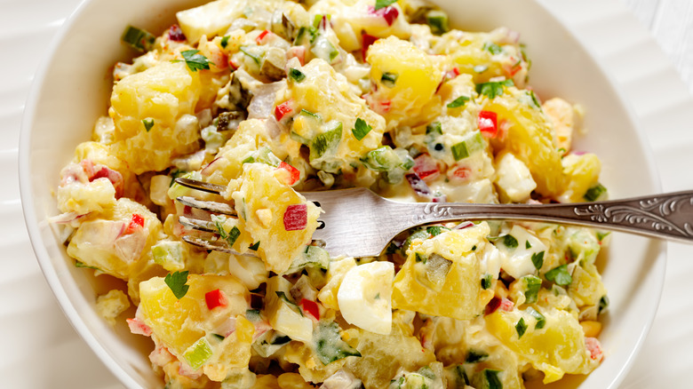 Per her recipe, Ray suggests elevating the taste of spuds by mixing in a chopped red bell pepper along with any of your favorite jarred or canned peppers, from jalapeños to hot pepper rings. The chef then adds a splash of hot pepper juice from the can or jar, and mixes the ingredients with some wine or cider vinegar and extra-virgin olive oil, ensuring a moist and flavorful punch with each bite. It's worth noting that, in addition to infusing the potatoes with a ton of flavor, the peppers also work to round out the texture of the dish, complementing the soft and tender spuds with their distinctive crunch.