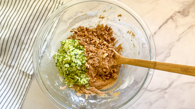 - Add the wet ingredients to the dry ingredients and then fold in the zucchini and nuts.