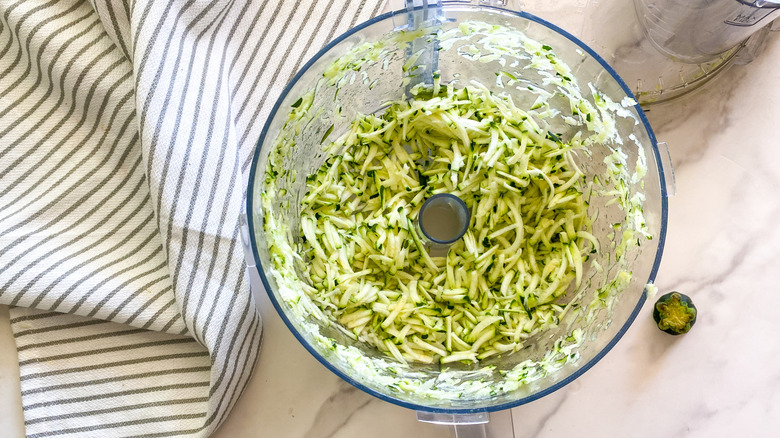 You'll need to grate the zucchini, so if you have a food processor with the grating blade attachment, that is your best bet. "If you don't have a food processor, you can use a box grater to grate the zucchini," Hahn says.