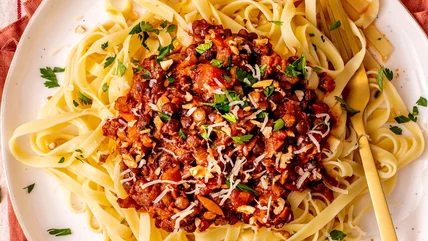 You can keep your recipe as simple as that, or you can combine the walnuts with a few other vegan elements to add more dimension to your dish. Mushrooms are a popular ingredient in plant-based Bolognese sauces due to their umami flavor and somewhat meat-like texture. To create a mushroom and walnut meat substitute, first blitz them separately in a food processor, then stir them together. You could also incorporate lentils (a good source of plant-based protein) by cooking them and stirring them in the sauce before you blend everything together. Whichever route you choose, you'll end up with a yummy, hearty, vegan Bolognese.