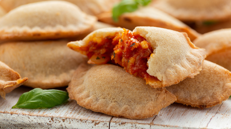 Of course, you'll find plenty of savory options too. Marinara is a common sauce used, along with cheeses like ricotta, provolone, mozzarella, and Pecorino, and extras like salami, fresh tomatoes, basil, and anchovies. Ricotta is a quintessential ingredient here, dating back to the World War II days when it was considered nothing more than a cheap byproduct of mozzarella. But modern versions of pizza fritta have evolved to include a wide variety of delicious toppings, including octopus, pesto, mortadella, parmesan, or even fruit and Nutella. While the calzones are often eaten on the go, they can also be served with a basil garnish and tomato sauce on the side for dipping. So, the next time you're in Naples (or just itching for something new at home), you may want to give pizza fritta a try.
