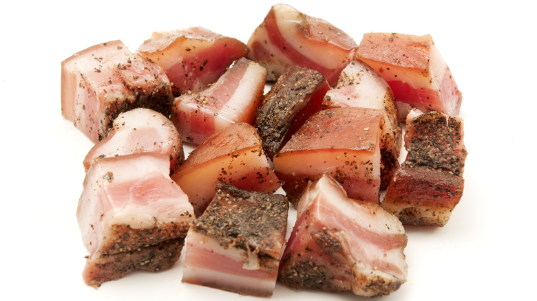 Guanciale may sound like a mouthful, and that's because it is — a delicious, delightful delicacy of an Italian cured pork jowl that's so good it could make a vegan question their moral convictions. But, vegetarian veto aside, guanciale also happens to be an exorbitantly expensive cut of meat that some uninitiated or uninformed foodies could very well pass up for less pricy pork products such as pancetta or prosciutto — even the best bacon can't compare to guanciale. But once you taste that melt-in-your-mouth flavor bomb that is a perfectly seared portion of guanciale, there's no going back.