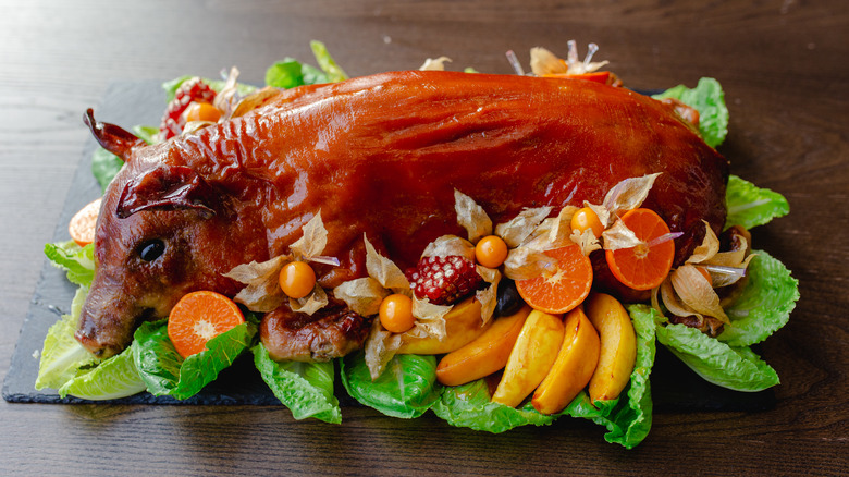For those that can move past the weirdness factor of consuming a whole pig, head and all, true tasty delight awaits. By cooking the entire suckling pig whole, the moisture of the meat is entirely preserved. It's pretty much impossible to overcook a suckling pig. Plus, all the drippings of fat and flavor are preserved within its crispy skin, and the meat within is nothing short of life-changing. And all that can be yours for the simple price of a little bit of cash. Especially considering how the complaint most often heard about pork is that it is dry (in texture and flavor), suckling pig is practically foolproof (especially with an apple in its mouth).