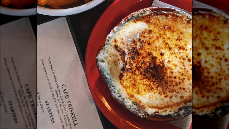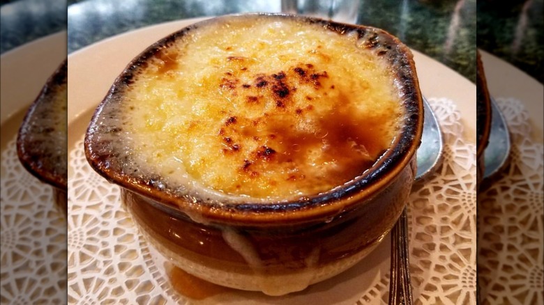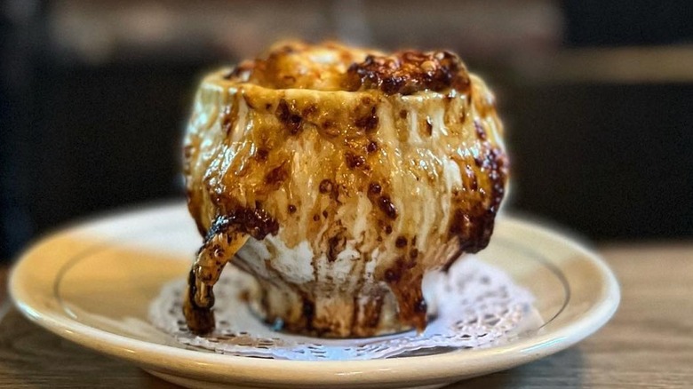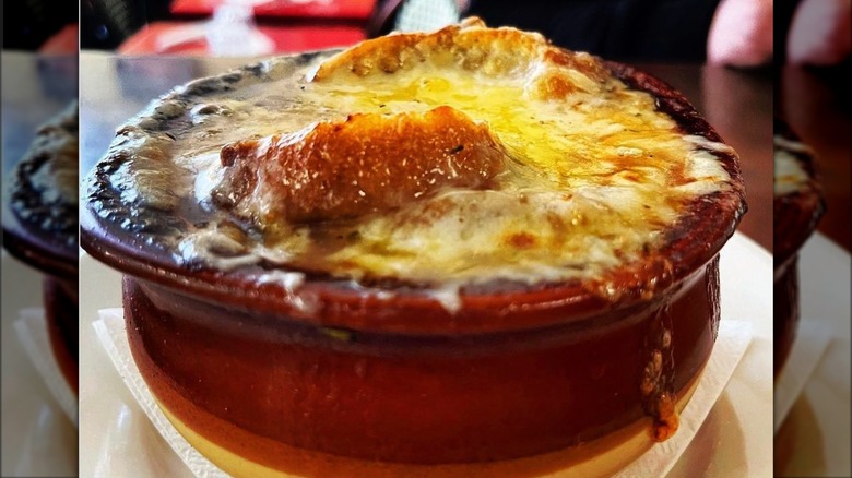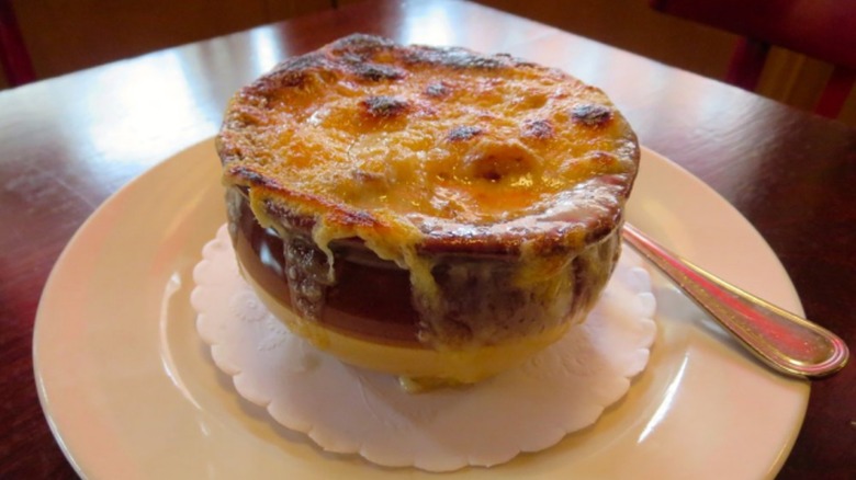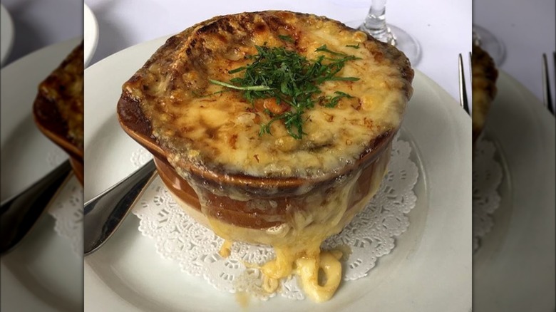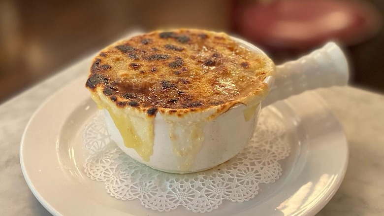 One of those favorites is, unsurprisingly, the onion soup gratinée. The French Onion soup, made with delicately sweet slow-cooked onions, deeply flavorful beef broth, and perfectly toasty and gooey cheese, is one of the most popular items on the menu, so much so that it's been reported that the restaurant goes through a minimum of 15 gallons a day.