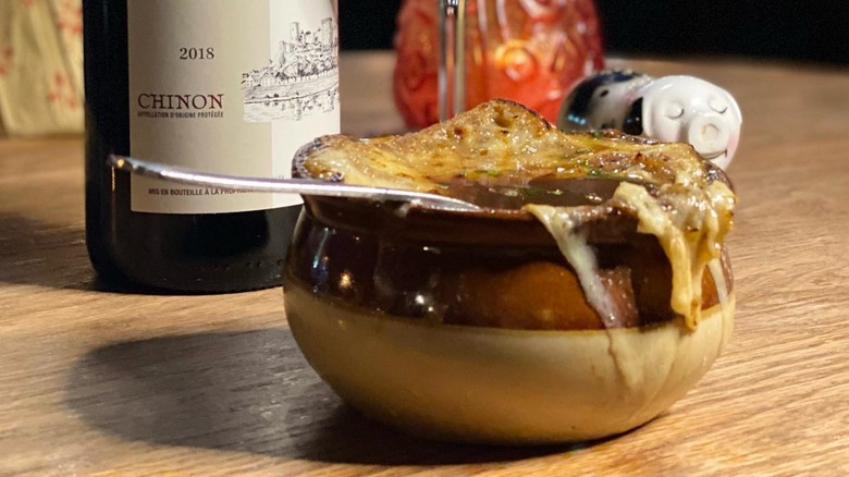 Cobble Hill in Brooklyn is full of quaint shops, picturesque streets lined with brownstones, and inviting cafes. Amongst those cafes is Bar Tabac, located on a corner on Smith Street. Embellished in wood and warm colors and emanating an overall old-school French tavern vibe, with a vintage bar decorated with antiques, Bar Tabac serves expected but reliably delicious bistro food. So it isn't surprising the menu includes the tried and true treat that is French onion soup. What makes this $14 Onion Soup gratinée stand out is its use of Porto, a Portuguese fortified wine, in the recipe.